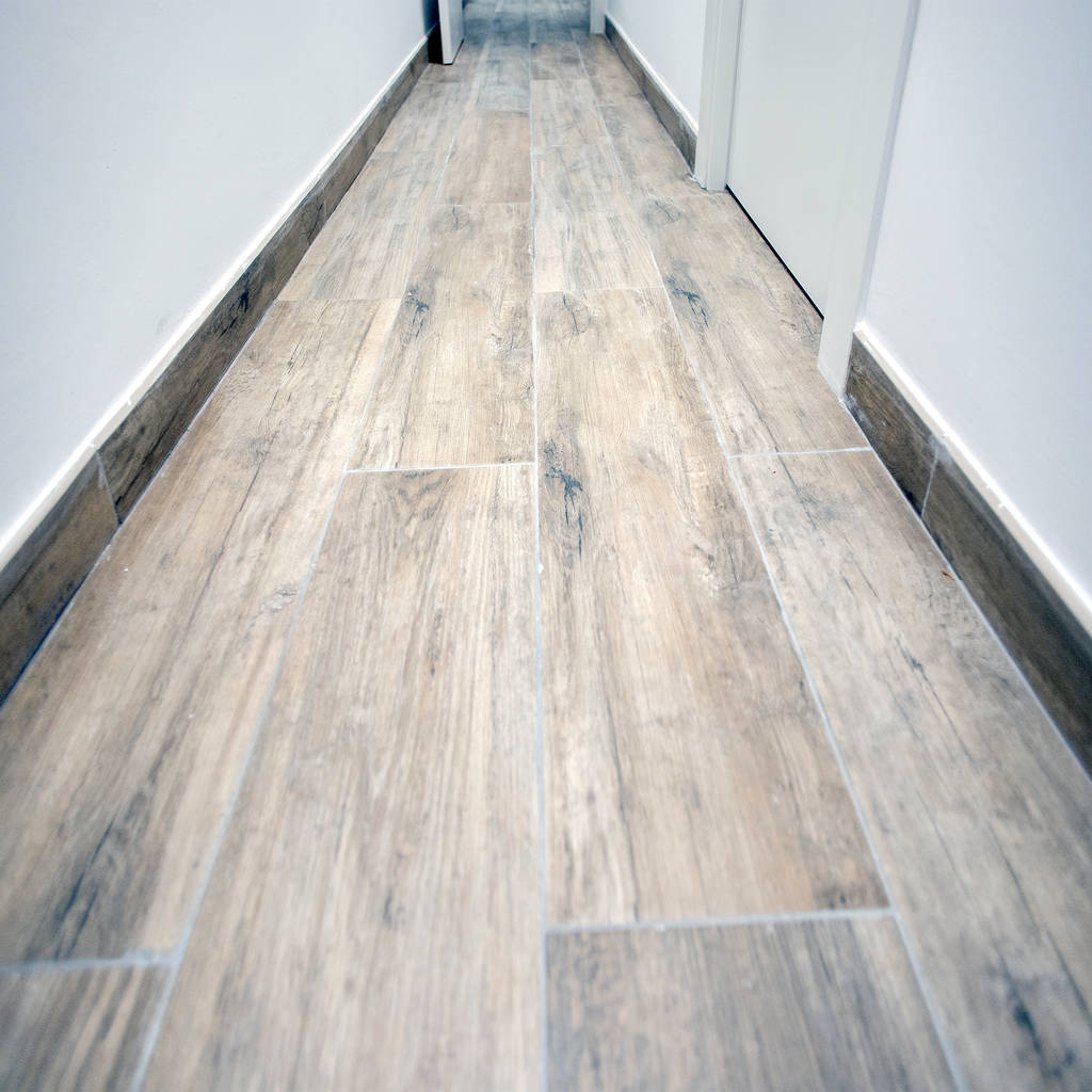 Suelos porcelánicos que imitan a madera. Es una opción muy habitual en viviendas con suelo radiante en las que se pretende aprovechar al máximo la alta inercia térmica de los materiales cerámicos. Hay una gran oferta en el mercado y las texturas están muy conseguidas. También las juntas; apenas se notan las lechadas.