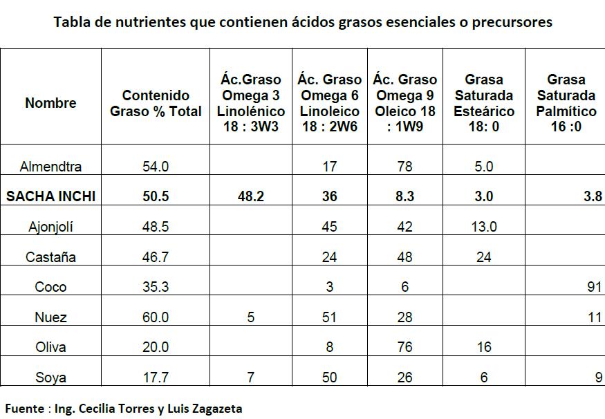 Composición nutricional del aceite de Sacha Inchi El aceite de Sacha Inchi contiene aproximadamente un 50% de ácidos grasos poliinsaturados omega 3. Esto lo convierte en un aceite parecido al de lino, muy valioso por ser una importante fuente de ácido alfa linolénico.