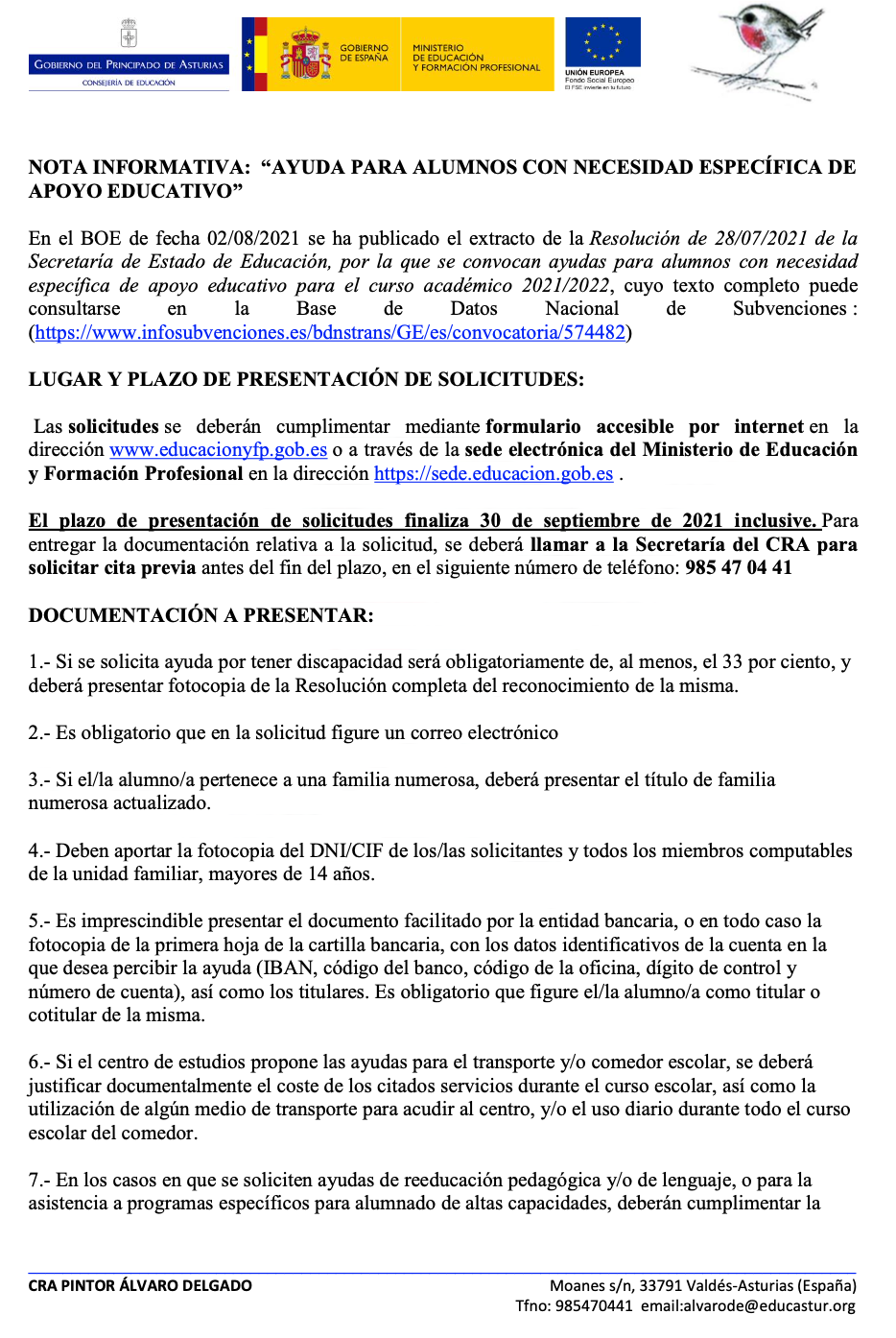 CRA PINTOR ÁLVARO DELGADO AYUDA PARA ALUMNOS CON NECESIDAD ESPECÍFICA DE APOYO EDUCATIVO