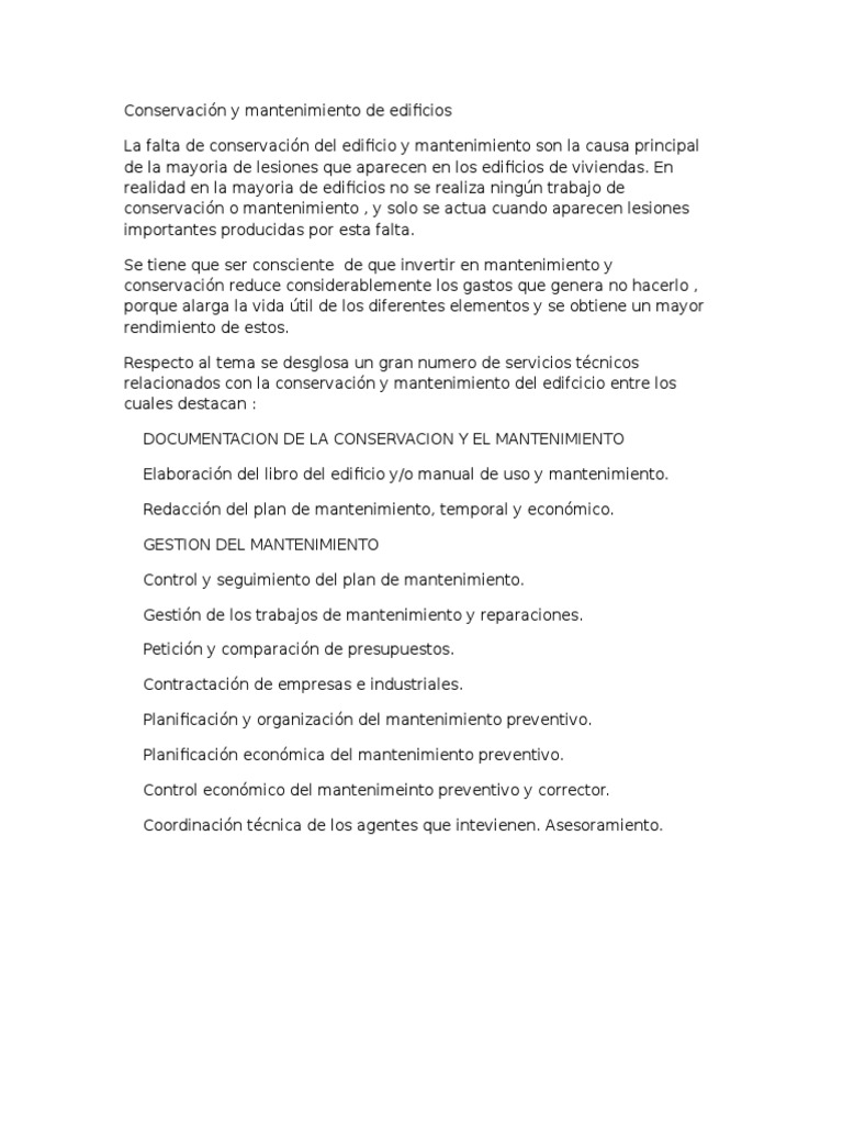 TEMA 1.- MANTENIMIENTO DE EDIFICIOS. 1.- DEFINICIÓN. Se consideran obras, trabajos y actuaciones de mantenimiento todas aquellas acciones encaminadas a la conservación física y funcional de un edificio a lo largo del ciclo de vida útil del mismo. Mantener, en general, significa conservar y también mejorar las