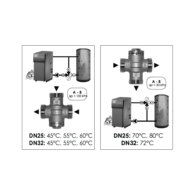 Válvula Anticondensación Biomasa-Leña 55º 1" FERCO. Envío Península. 24/48h. Válvula de 3 vías DN25 1" con rosca "Macho" para control de temperatura de condensación. Garantiza el retorno a una temperatura fija 55ºC , al grupo térmico ó caldera para evitar condensaciones. Estanqueidad: estanco en A-AB; En B-AB tasa de fuga del 3% del.