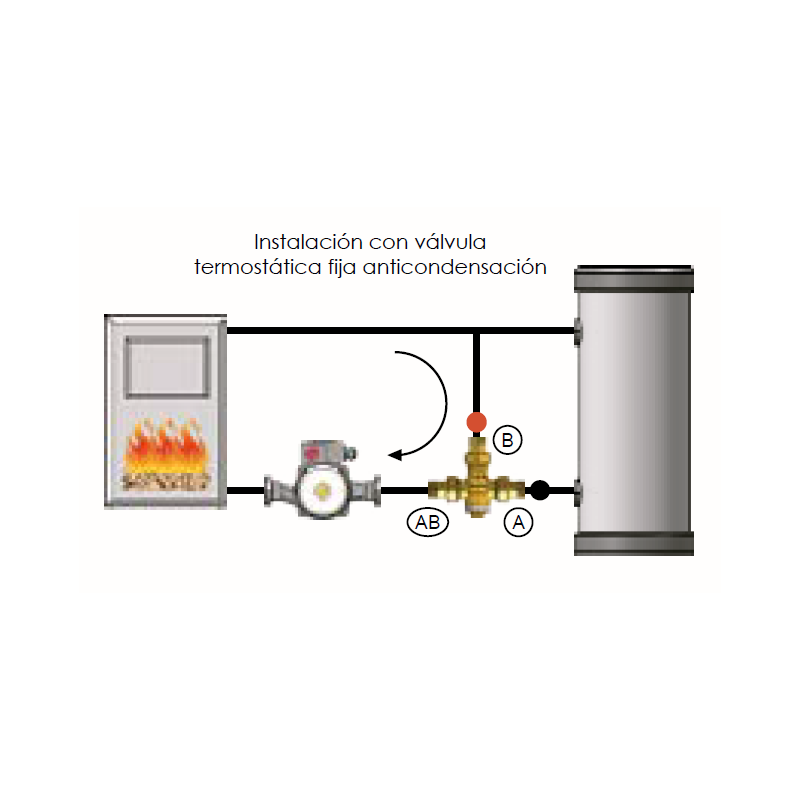 La válvula termostática anticondensación o anticondensados se instala para ajustar la temperatura del fluido en el circuito de retorno hacia la hidroestufa de pellets. Esta válvula se ajusta a un valor de consigna, entorno a unos 50ºC, para mantener automáticamente esa temperatura a la entrada o retorno de la estufa.