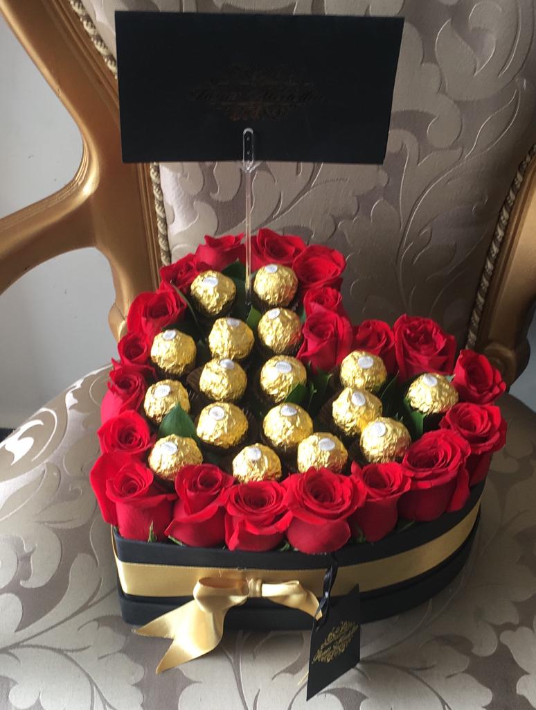 Caja de corazon mitad rosas mita chocolates Ferrero Rocher. Flores Medellín