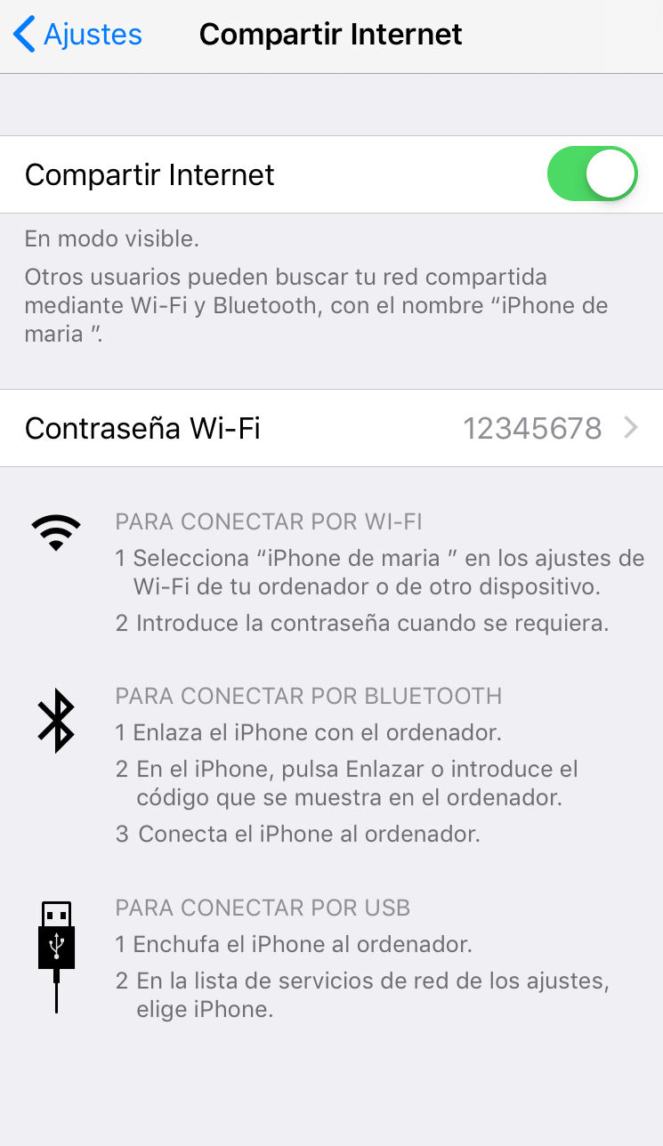 Para compartir internet a través del bluetooth de tu iPhone, basta con seguir estas indicaciones: En tu iPhone, ve a Ajustes > Bluetooth y deja esta pantalla abierta. Desde el otro dispositivo, utiliza su bluetooth para conectarte al iPhone. Puede que te pida confirmar un código de enlazado. Y ya está, ya deberías estar conectado a internet.