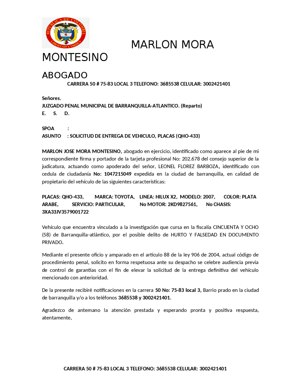 Devolucion vehiculo petición para entrega de vehículo FISCALÍA