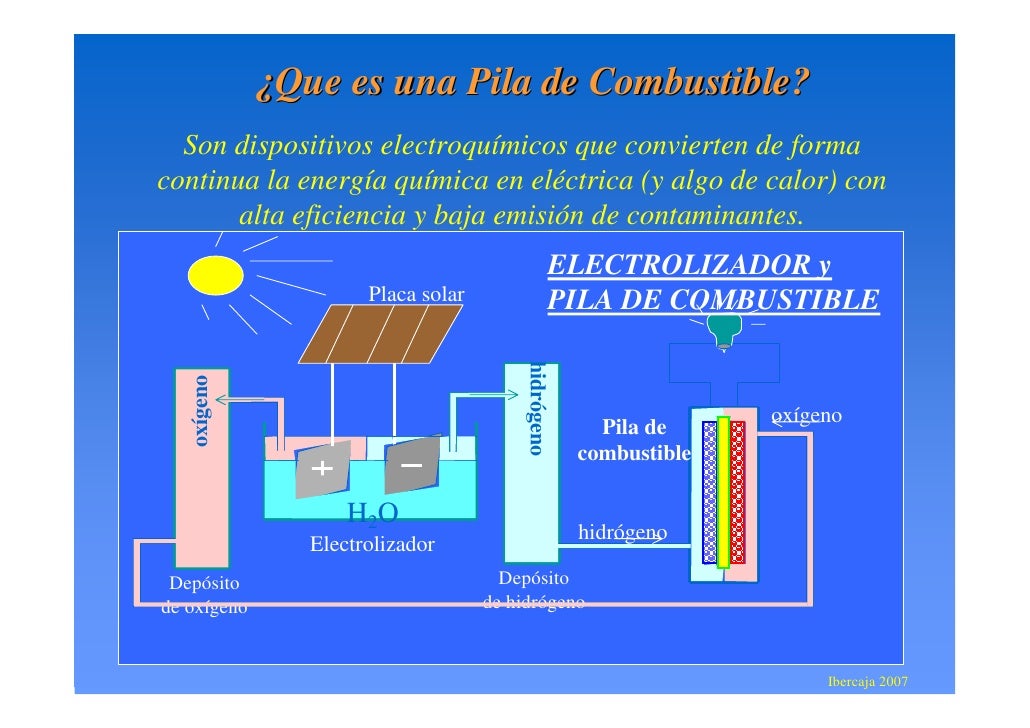 Una pila de combustible es un dispositivo electroquímico que transforma de forma directa la energía química en eléctrica. Parte de un combustible (generalmente hidrógeno) y de un comburente (en muchos casos oxígeno) para producir agua, electricidad en forma de corriente continua y calor. Tiene diversas partes: Electrodos (ánodo, donde se.