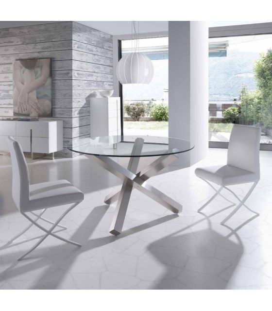 Mesa comedor redonda cristal modelo 1042 Angel Cerdá S.L. Mesa comedor redonda de diseño moderno con tapa fija de cristal templado de 12mm. Su original base de acero inoxidable cromado de 22 micras es uno de los elementos clave a destacar de su diseño. Una mesa perfecta para aportar luminosidad y vanguardia a tu cocina, salón o comedor.