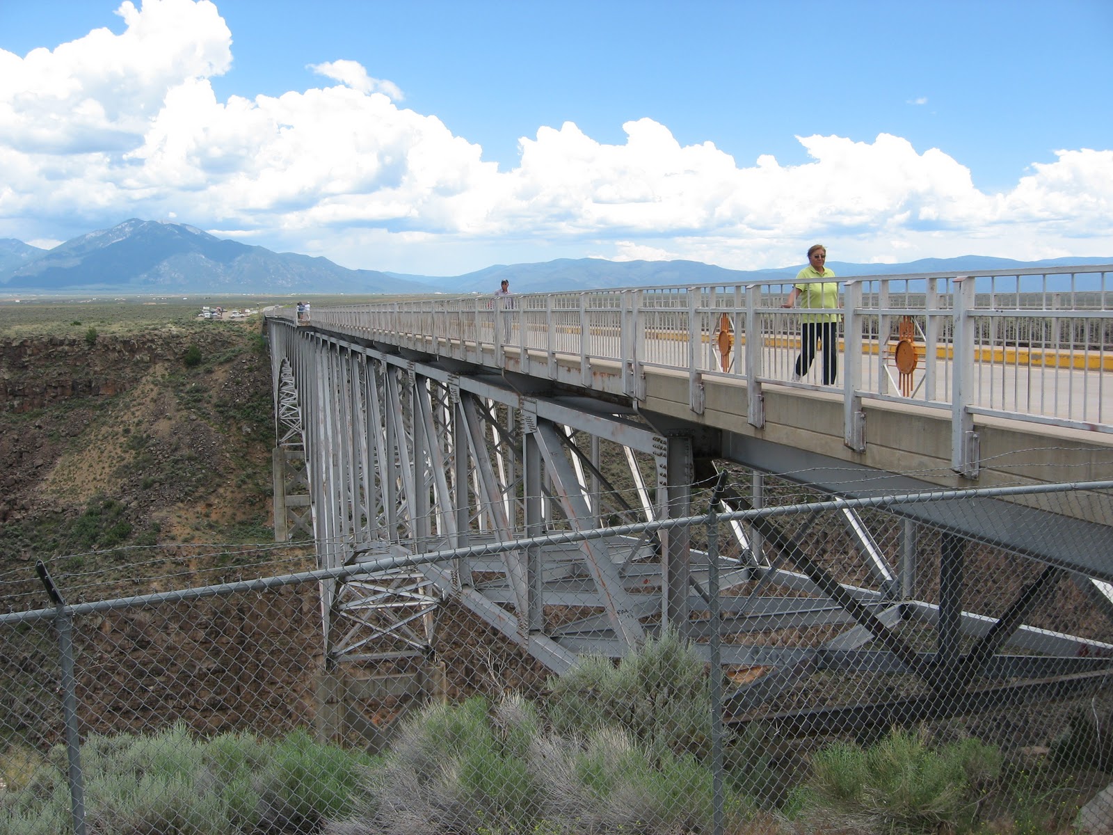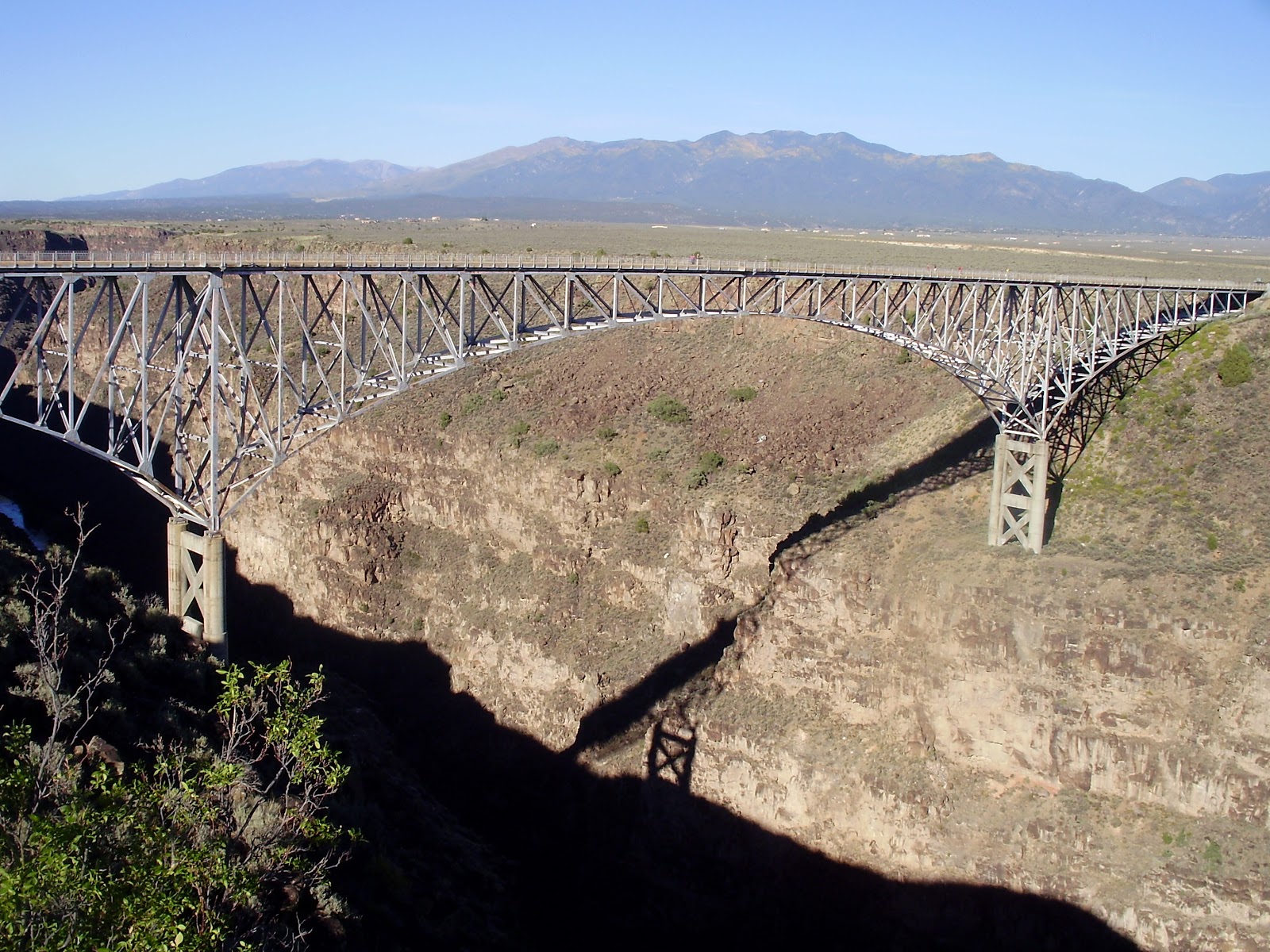 Ranchos de Taos, New Mexico. The Rio Grande Gorge is an unexpected 1,300-foot-wide crack in the flat, empty tablelands of northern New Mexico. US 64, a two-lane blacktop, crosses it on a bridge built in 1965. Its designers included sidewalks -- obviously for tourists, since there's no reason that anyone would just be strolling out here in the.
