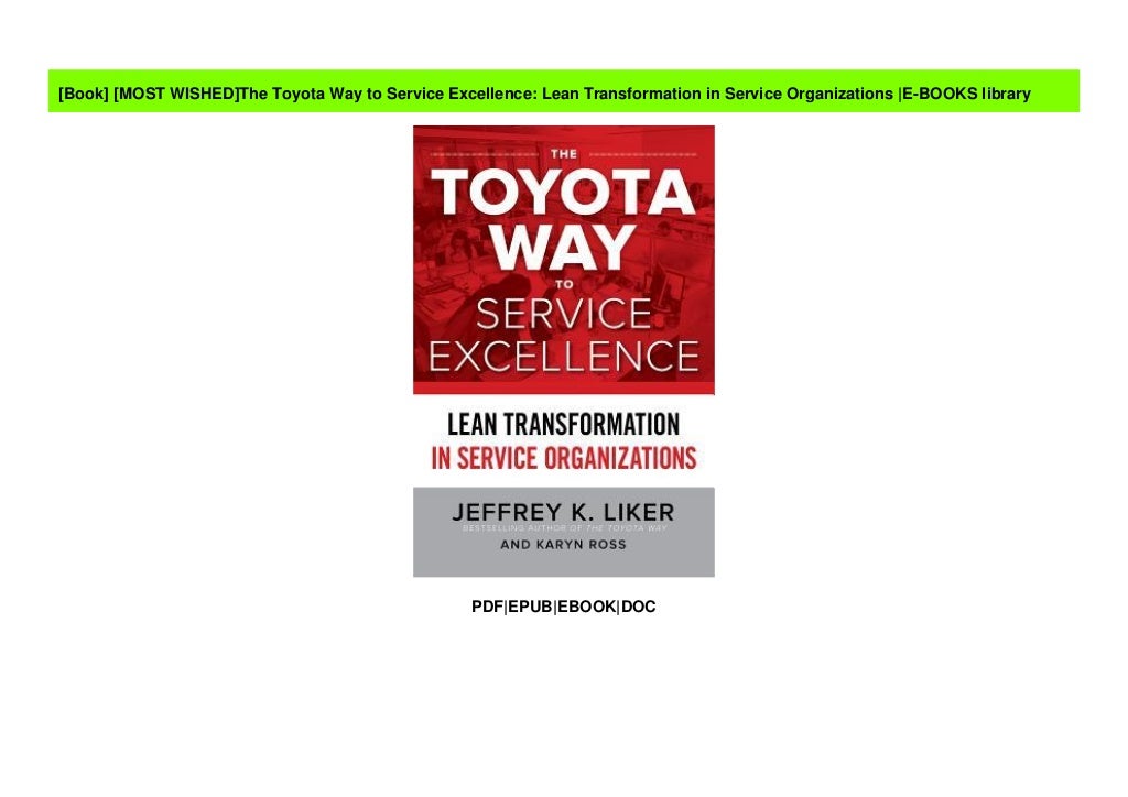 The Toyota Way to Service Excellence: Lean Transformation in Service Organizations: Lean Transformation in Service Organizations - Ebook written by Jeffrey K. Liker, Karyn Ross. Read this book using Google Play Books app on your PC, android, iOS devices. Download for offline reading, highlight, bookmark or take notes while you read The Toyota Way to Service Excellence: Lean Transformation in.